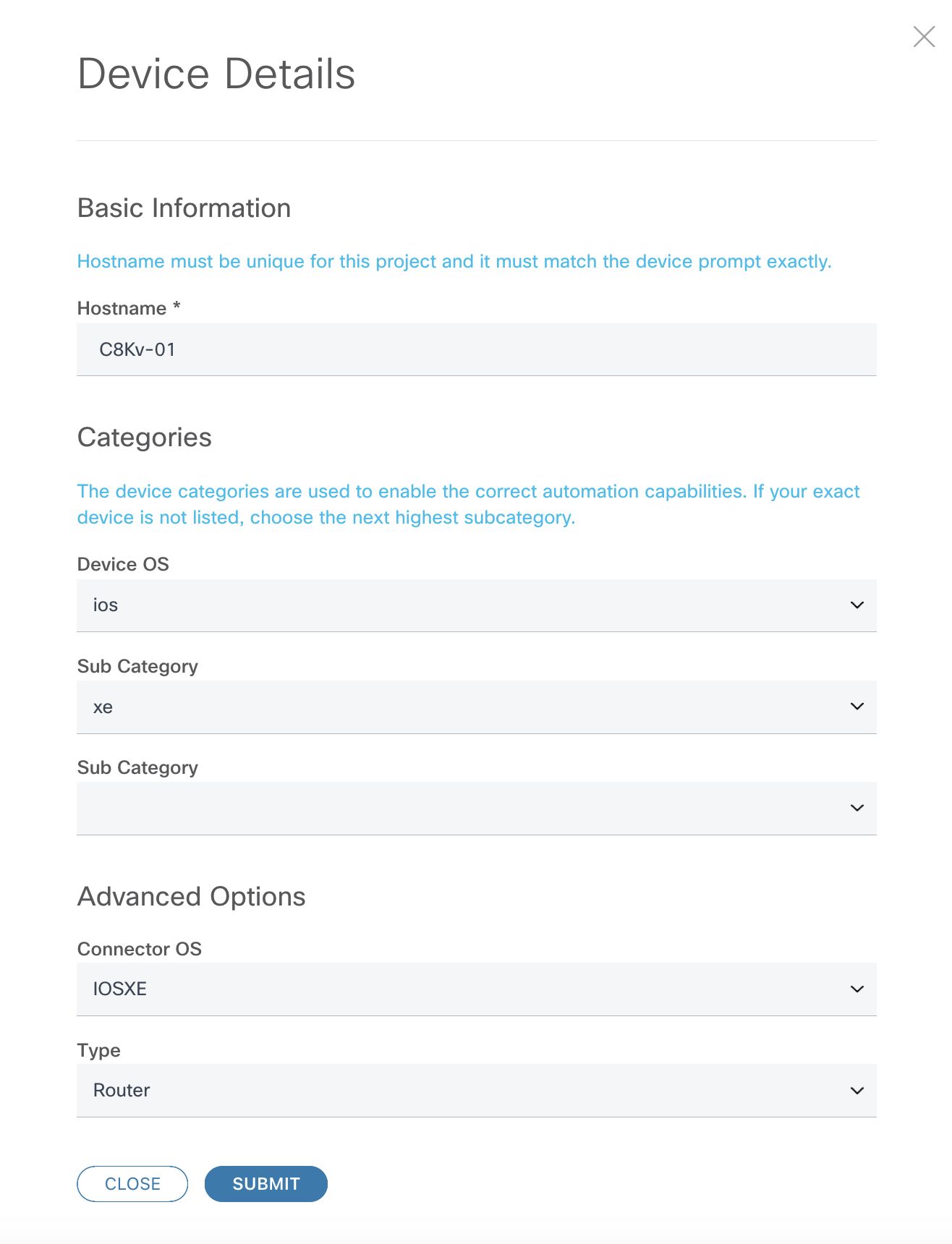In the Device Details pop-up, enter the below information to add the CSR1Kv device to your lab topology.