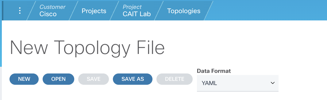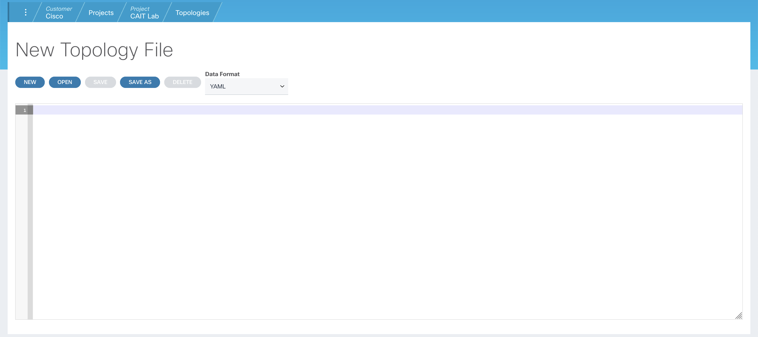 Upon navigating to Topologies, you will see a blank topology view (file). If you had a pre-existing topology, you could open it using Open.