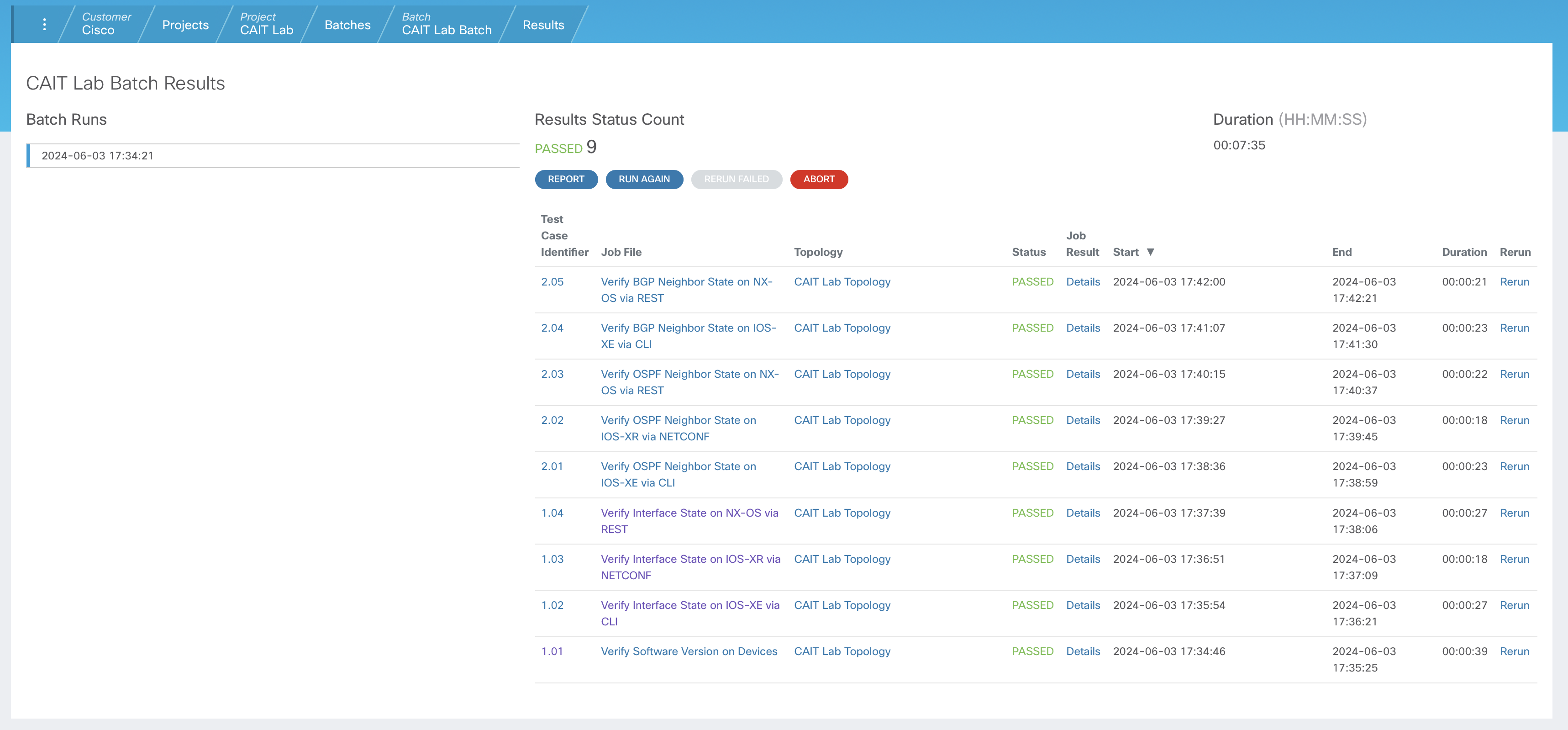 The Job File column in this table provides a direct link to the Job File page of each test case. The Topology column shows the topology file used by each Job File. Notice how the Topology is set to the topology file that you selected earlier when changing the default topology for all Job Files. As each test case transitions to a "PASSED" or "FAILED" status, data will be populated in additional columns in this table. Take a moment to observe how this table is updated as each test case completes.
